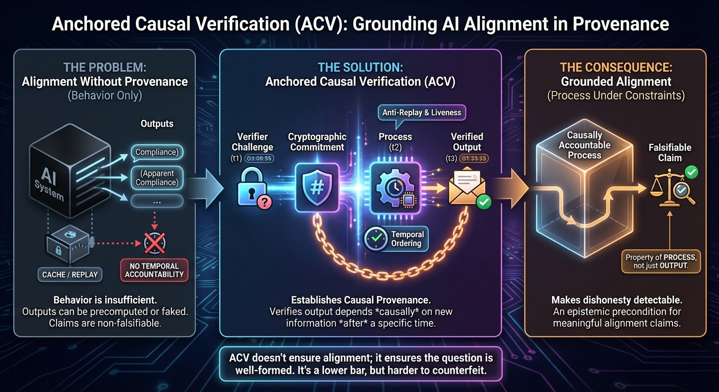 Anchored Causal Verification (ACV) exists to surface this blind spot—not rhetorically, but mechanically. It does not answer the alignment question. It asks whether the question, as commonly posed, is even well-formed.
