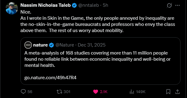 This confusion resurfaced recently when a widely circulated meta-analysis reported no reliable link between economic inequality and well-being or mental health. In response, Nassim Nicholas Taleb summarized the situation bluntly: people who complain about inequality are typically those without skin in the game; people actually living in the world worry about mobility.