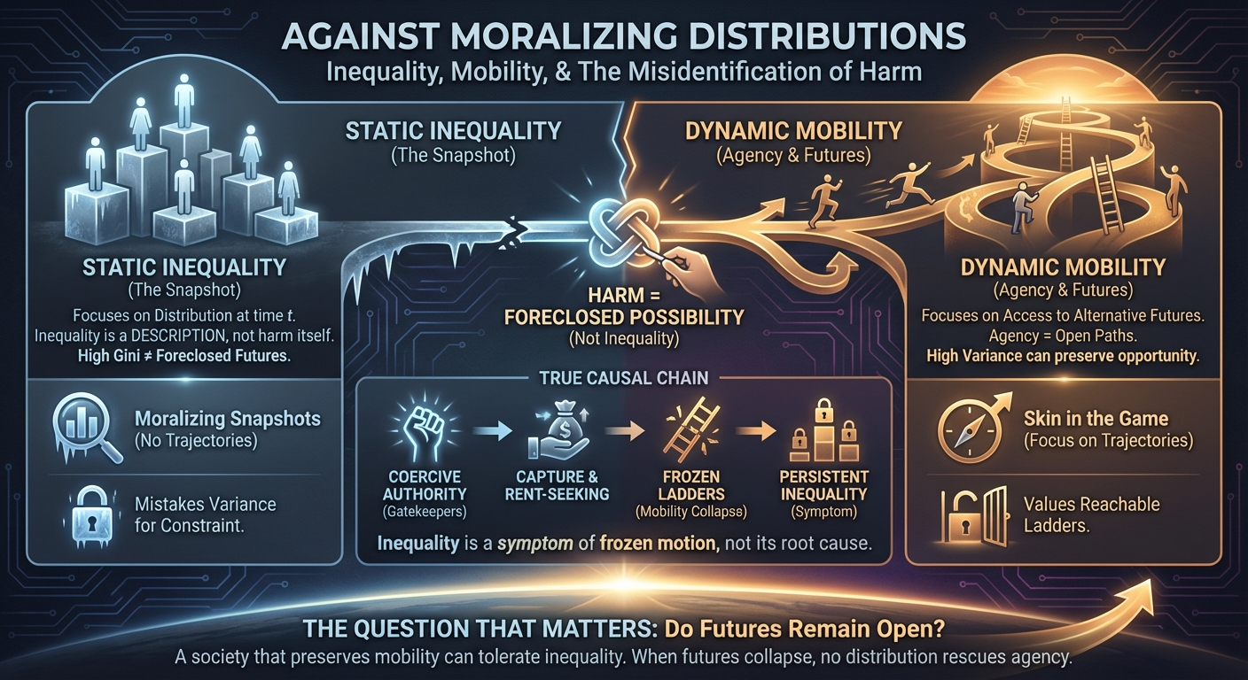 A recurring confusion in political and moral discourse is the treatment of inequality as if it were itself a form of harm. It isn’t. Inequality is a distributional description. Harm is a structural constraint. Conflating the two replaces causal analysis with moralized snapshots.
