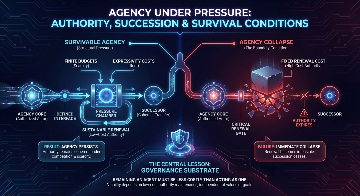 The paper addressed here asks a more elementary question: whether agency itself remains viable when authority is scarce, expressivity carries a cost, successors compete for endorsement, and authority must periodically be renewed or relinquished under fixed rules.
