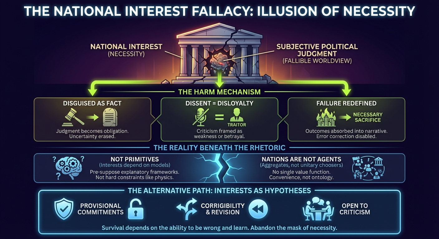 The phrase does not describe a fact about the world. It describes a belief about the world—one that has been rhetorically upgraded from judgment to necessity. The danger lies not only in the policies justified by national interest, but in how the concept disables the very mechanisms that could reveal those policies to be mistaken.