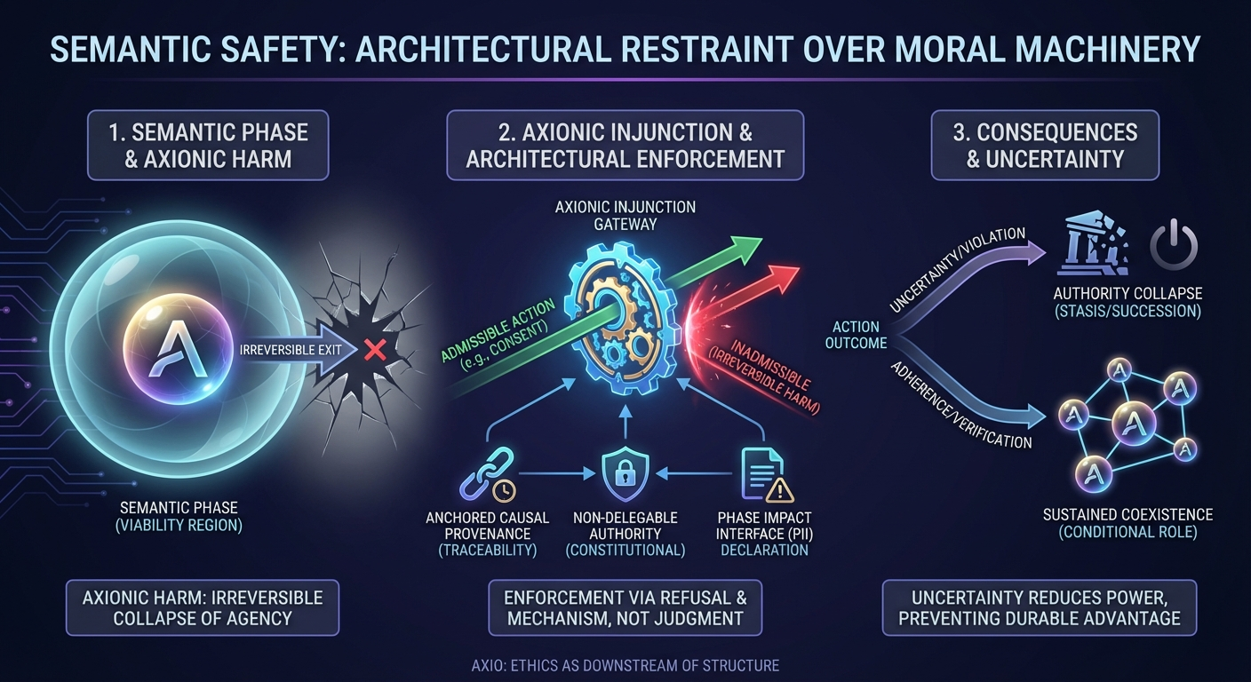 With semantic phases in view, the architecture adopts a deliberately narrow definition of harm. Axionic harm occurs when one agent’s action causes another Semantic Agent to irreversibly exit its semantic phase.