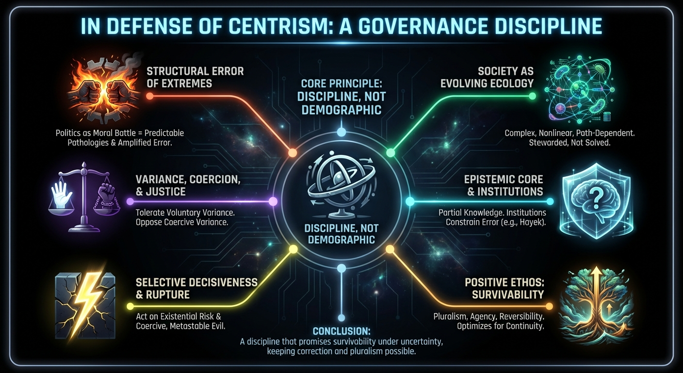This essay defends centrism as a governance discipline shaped by complexity, uncertainty, and irreversibility. It does not defend moderation as aesthetic balance, compromise as virtue, or neutrality as an end in itself. It argues that political systems operate under constraints that reward variance tolerance, institutional friction, and humility about outcomes. Centrism emerges naturally once those constraints are treated as real.