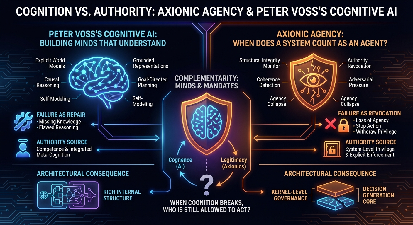 This essay compares two non-behaviorist responses to that realization: the cognitive AI approach developed by Peter Voss, and the Axionic approach to agency and alignment. Although these frameworks share important premises, they diverge at a critical layer: the treatment of authority, failure, and what it means for a system to remain a legitimate agent under stress.