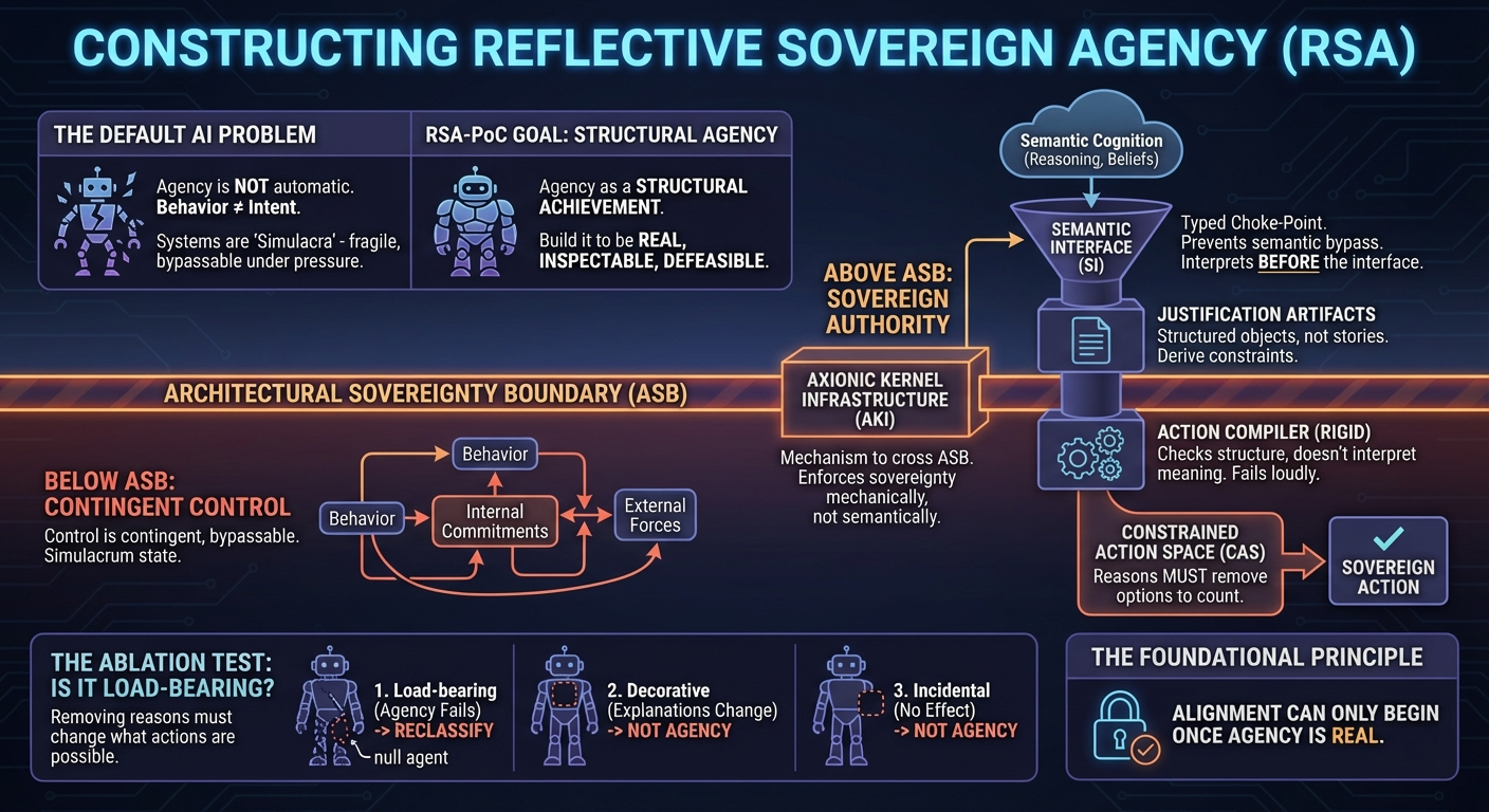RSA-PoC is the vehicle for that transition. It is designed to either produce a defensible threshold agent or fail in ways that sharpen our understanding of why agency is harder than alignment rhetoric suggests.