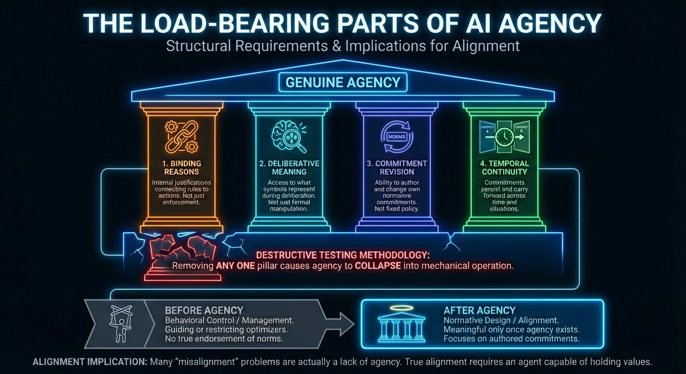 Once agency exists, alignment shifts from behavioral control toward normative design. The central question becomes what commitments the agent can author, how it revises them, and how those commitments persist over time. This does not make alignment easy, but it makes it coherent.