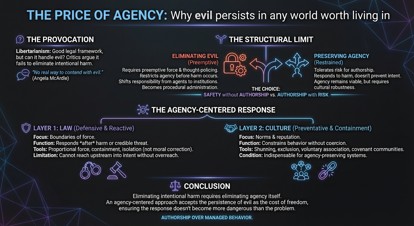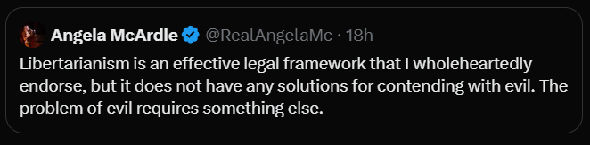 A recent tweet by Angela McArdle raised a familiar concern. Libertarianism, she suggested, functions well as a legal framework, yet offers no real way to contend with evil. The implication is straightforward. Harm exists. Some people reliably cause it. If a political philosophy cannot account for that reality, it risks appearing evasive or incomplete.