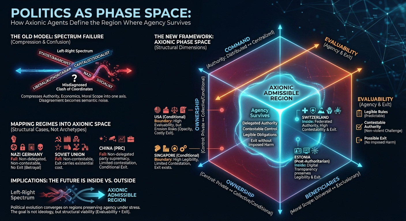 From an Axionic perspective, political systems carve out regions of a larger phase space. Some regions preserve agency under variation and stress. Others do not.
