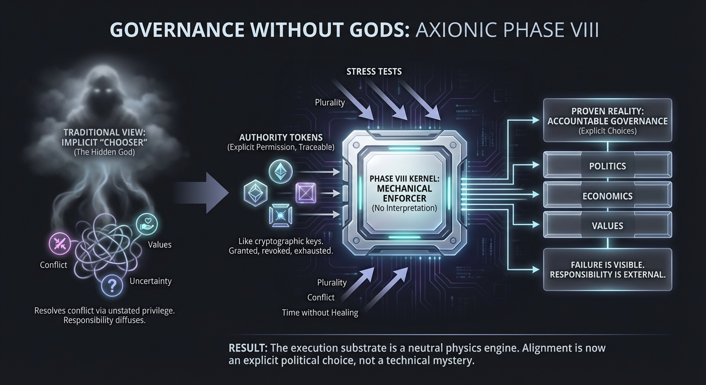 Phase VIII resolves a confusion that has haunted alignment discourse from the beginning. The execution substrate cannot reconcile values without becoming a political actor. It can only enforce what has been authorized. That constraint is not a weakness. It is the condition under which responsibility survives. Alignment beyond this point is no longer a technical mystery. It is an explicit choice.