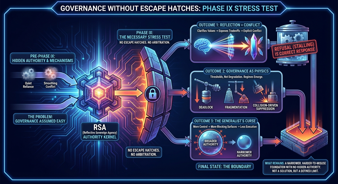 This reframing is central to why Phase IX matters for RSA. It shows that reflective sovereign agency does not fail because agents are insufficiently capable. It fails because authority is genuinely missing.