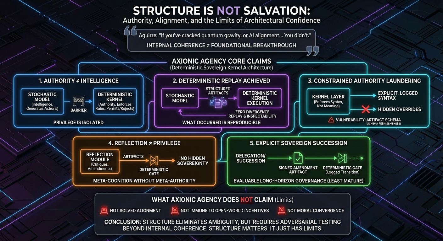 Its strongest results concern architecture: bounded authority, deterministic replay, and explicit privilege transitions within a defined substrate. Broader alignment success would require evidence beyond internal coherence and controlled experiments.