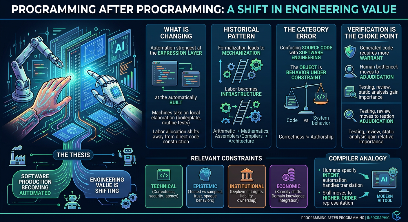Programming is being absorbed into a broader discipline of computational governance. The keystroke is losing status as the dominant unit of engineering value. Framing, constraint, verification, authority, and warrant are moving toward the center.