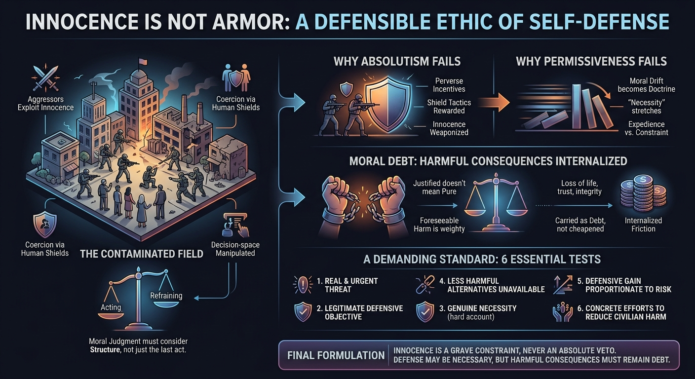 A defensible ethic of self-defense must preserve the right to resist coercion without allowing innocence to become armor for aggressors. It must also ensure that when innocents are foreseeably harmed, the harm is carried as debt, reviewed with severity, and never treated as morally clean.
